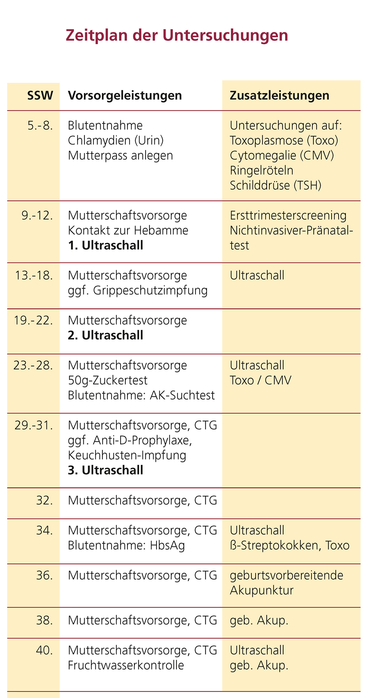 Wir werden uns während der Schwangerschaft zu regelmäßigen Kontrollen in der Praxis sehen, anfänglich alle 4 Wochen, später dann alle 2 Wochen und gegen Ende der Schwangerschaft ggf. auch häufiger. Natürlich kann von der normalen Planung immer individuell abgewichen werden. Sie bekommen von uns zu Beginn der Schwangerschaft in unserer Praxis eine Übersicht über den zeitlichen Ablauf der Termine und die geplanten Untersuchungen (Grafik). Wir bieten in unserer Praxis neben all denen in den Mutterschaftsrichtlinien vorgeschriebenen Untersuchungen weitere Vorsorgeuntersuchungen an.